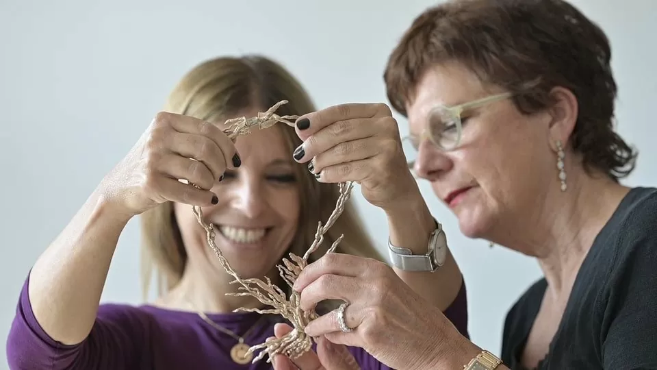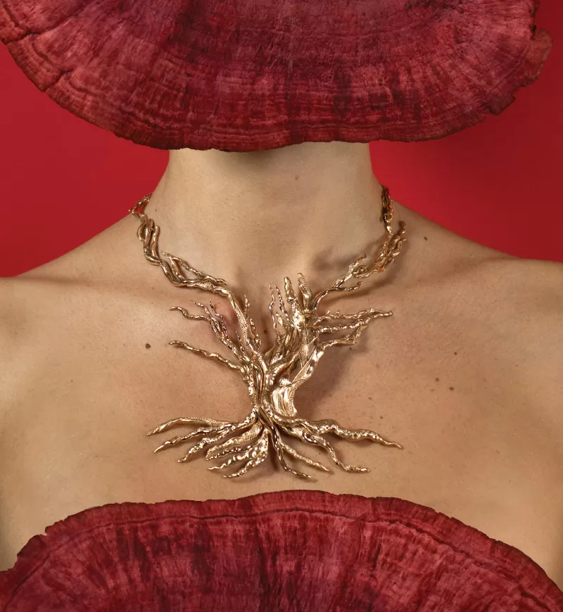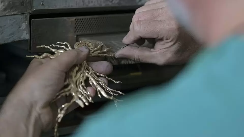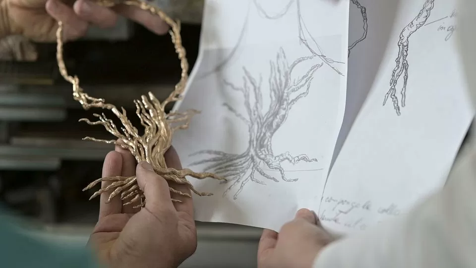 Disegno CAD, prototipazione con stampante 3D, protofusione a cera persa, ramage lavorato, assemblato e snodato a mano, realizzazione chiusa a cassetta, superfici martellate a mano alternate ad aree lucide e ad aree incise 24 × 15 cm.
